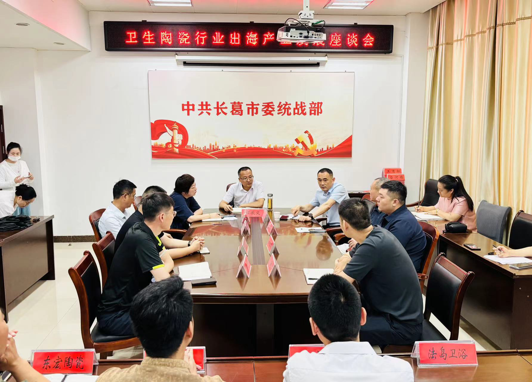 6月11日,长葛市工商联召开卫生陶瓷行业“出海”产业发展座谈会。市委常委、统战部部长郝长义出席会议,统战部副部长、工商联党组书记许洁,工商联主席尚军伟及全市14家陶瓷和浴室柜企业参加会议。