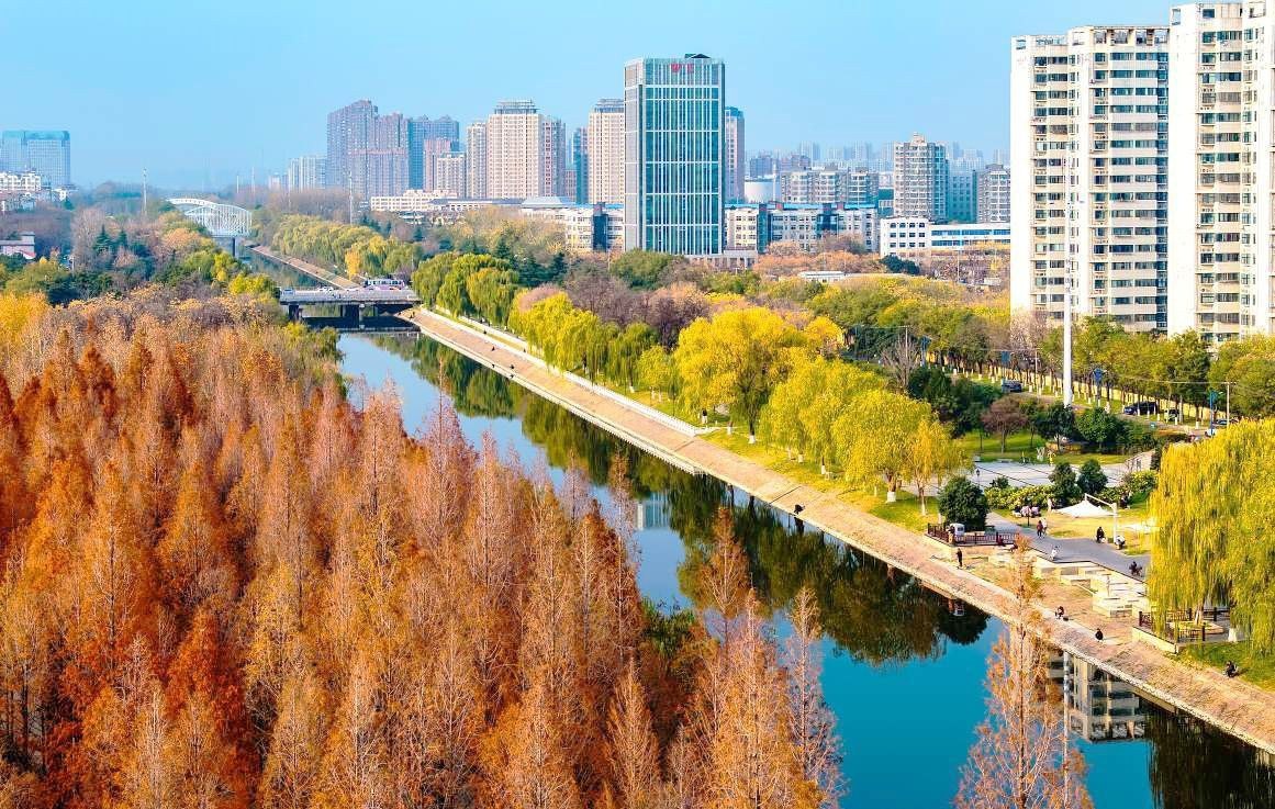 12月13日,冬日暖阳下,市区清潩河如一条碧绿丝带穿城而过,河道两岸彩林叠翠,与清澈的河水相映成趣。波光与树影构成了“半城彩林半城水”的秀美画卷。(