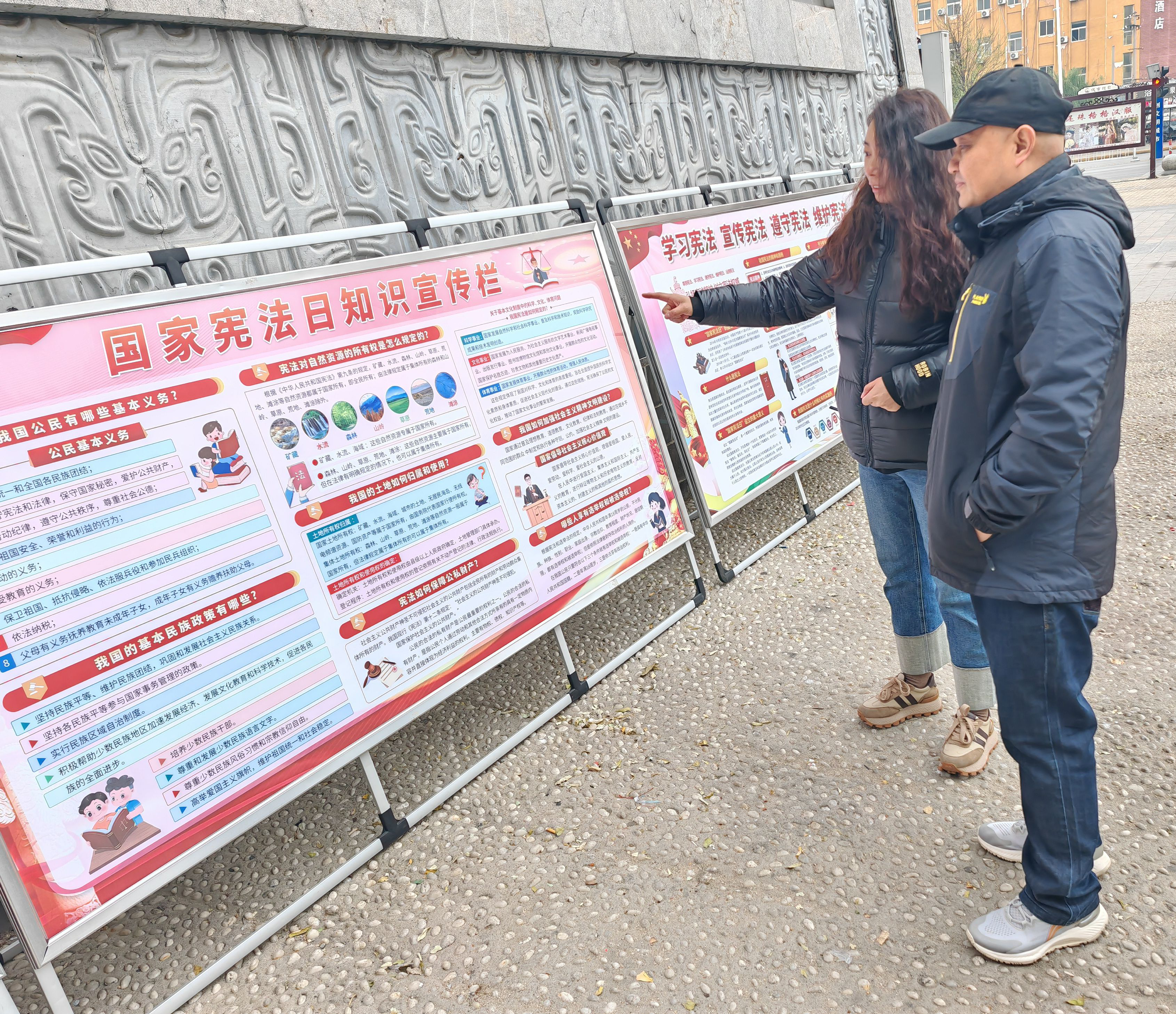 宪法宣传进公共场所。组织部机关干部参加2024年“宪法宣传周”启动仪式,通过阅览宪法宣传展板学习交流宪法知识,并向群众讲解宪法中公民的基本权利和基本义务等内容,重点宣传《中国共产党统一战线工作条例》《宗教事务条例》等相关法律法规和政策。