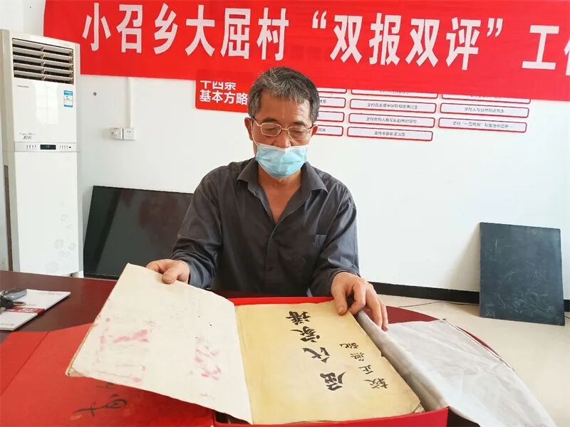 当日上午,天气异常炎热,田间地头是一派丰收的景象。走进建安区小召乡大屈村,就看到村民在忙着收麦子。刚刚收完自家小麦的屈保卫,小心翼翼地拿着一个红色盒子来到村委会,盒子里面装的是《屈氏家谱》。