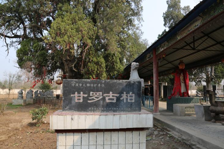甘罗古柏位于许昌市鄢陵县柏梁镇甘罗村甘罗墓前,世传汉柏。古柏高17米许,树围4.5米,至今已二千余年,此树虬根盘错,挺拔苍翠,为古鄢陵八大景之一。据《史记》载:“罗,下蔡人,秦左丞相甘茂孙,年十二,能请张唐相燕,复请五乘,为唐报赵,说得五城。以广河间,还报秦,乃封罗。”甘罗受到秦王重用以后,正欲施展才华效力秦时,不料一夕因疾而卒。秦王甚惜之,许以原籍安葬。灵柩从秦国通过水路运往下蔡时,船行至此搁浅(今村东确有古蔡河故道遗迹)。故而葬此。后为其立祠,昭示后人。古柏对研究古代气候变迁、地貌演变及植物生长历史具有重要参考价值,同时具有很高的旅游观赏价值。